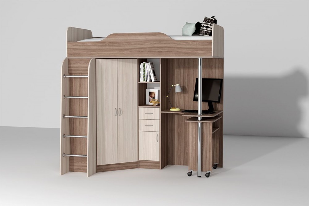 В комплект входит: кровать, внизу которой расположены вместительный угловой шкаф (полки и штанга), стеллаж для книг и компьютерный стол с дополнительным столиком.