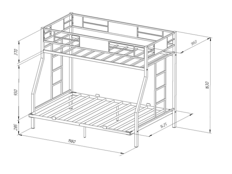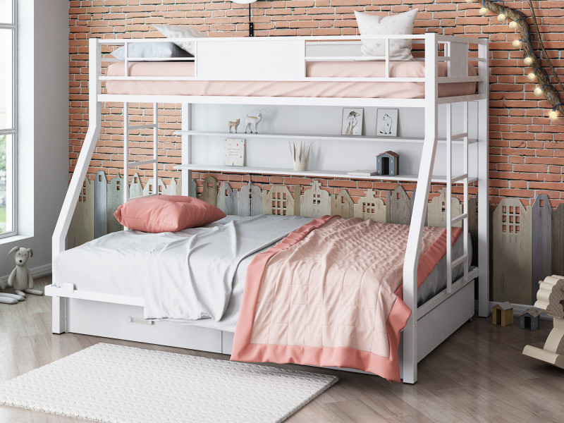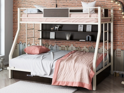 Металлическая двухъярусная кровать "Гранада-ПЯЯ 140" может использоваться в спальне подростков и взрослых, так как способна выдерживать нагрузку до 200 кг на одно спальное место. Конструкция кровати предусматривает спальные места разных размеров: верхнее 90*190 см и нижнее 140*190 см. Кровать оборудована полкой для книг или других вещей. Под нижним спальным местом располагаются выкатные ящики для хранения постельного белья. В отличие от кроватей из ЛДСП кровать из металла выглядит менее громоздкой.