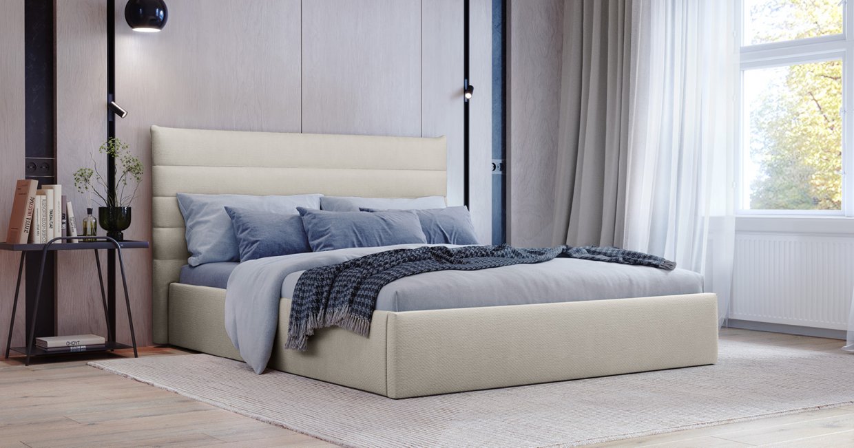 Модная новинка в семействе интерьерных кроватей. Форма мягкого объемного изголовья подчеркнута горизонтальной стежкой.