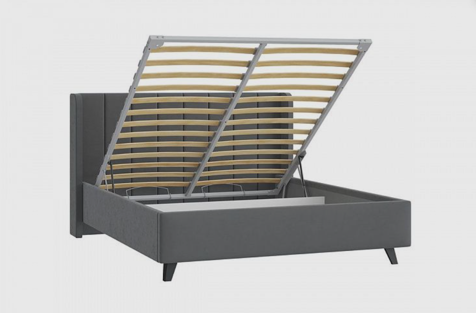 Кровать комплектуется ортопедическим основанием с подъёмным механизмом и бельевым ящиком.