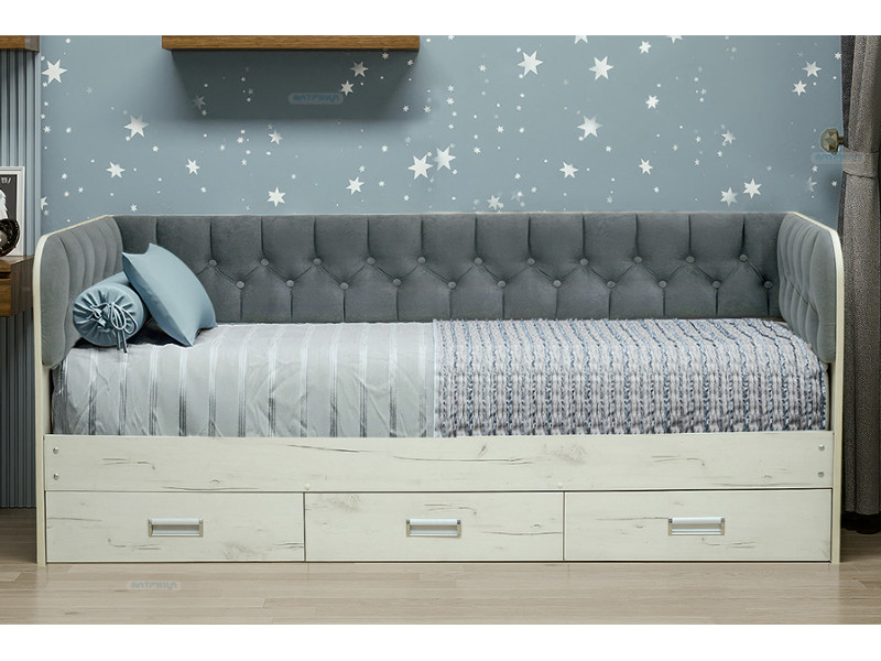 Кровать с продольной мягкой спинкой софа №14.1 дуб крафт белый велюр 032 (Матрица)