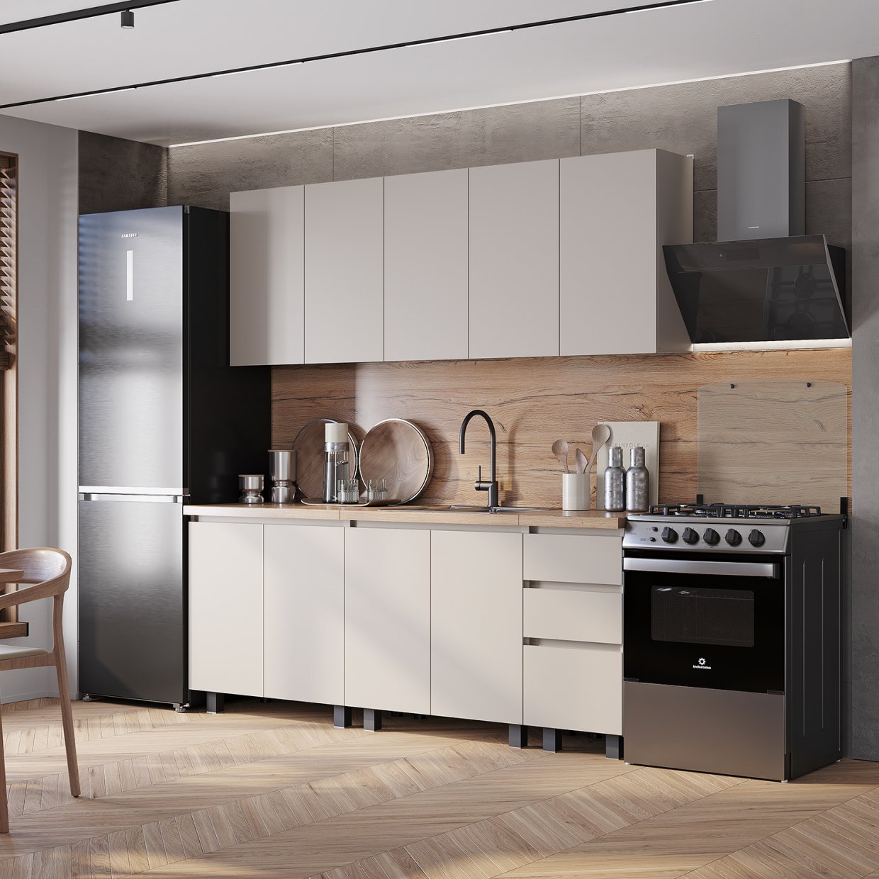 Кухня "Честер" - это минималистичная модель для современной кухни. Фасады и корпус выполнены в трендовом оттенке "кашемир", который идеально подойдет для интерьера в натуральных тонах. Столешница в теплом цвете "дуб кера", повторяющая текстуру дерева, добавляет кухне уюта. Благодаря отсутствию лицевой фурнитуры ежедневное использование станет проще, а уборка - приятнее. Особенную выразительность дизайну этой модели придают стильные черные квадратные опоры. Четкие линии модулей создают ощущение порядка и гармонии.