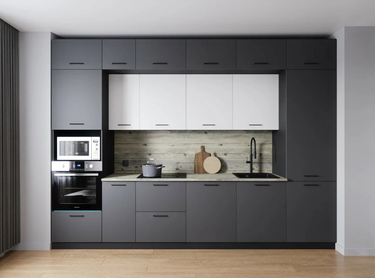 Мойка, стеновая панель, плинтус, техника в стоимость не входят.