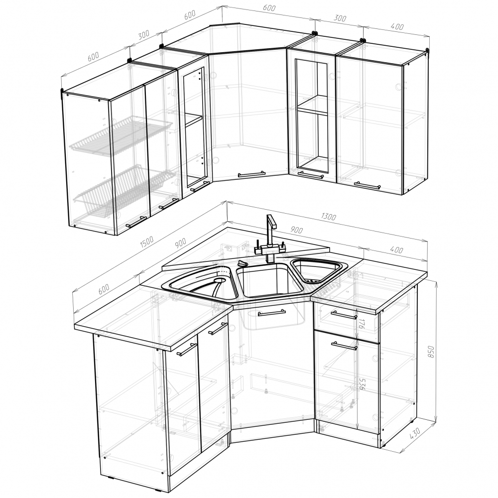 Ширина: 1500*1300 мм; Глубина: 600 мм (со столешницей)