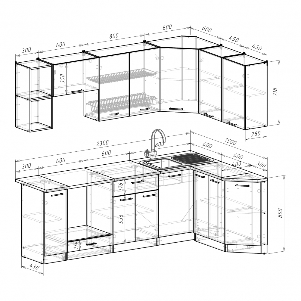 Ширина: 2300*1500 мм; Глубина: 400/600 мм (со столешницей)