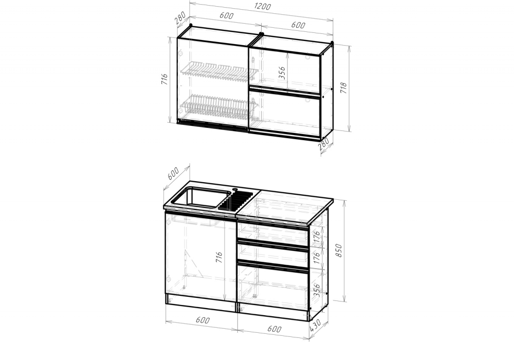 Ширина: 1200 мм; Глубина: 600 мм (со столешницей)