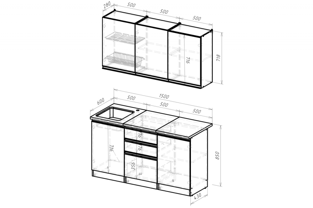 Ширина: 1500 мм; Глубина: 600 мм (со столешницей)