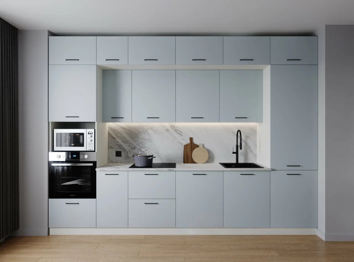 Модули первого верхнего яруса с фасадами со свесом 12 мм, что позволяет открывать их без установленных ручек.
