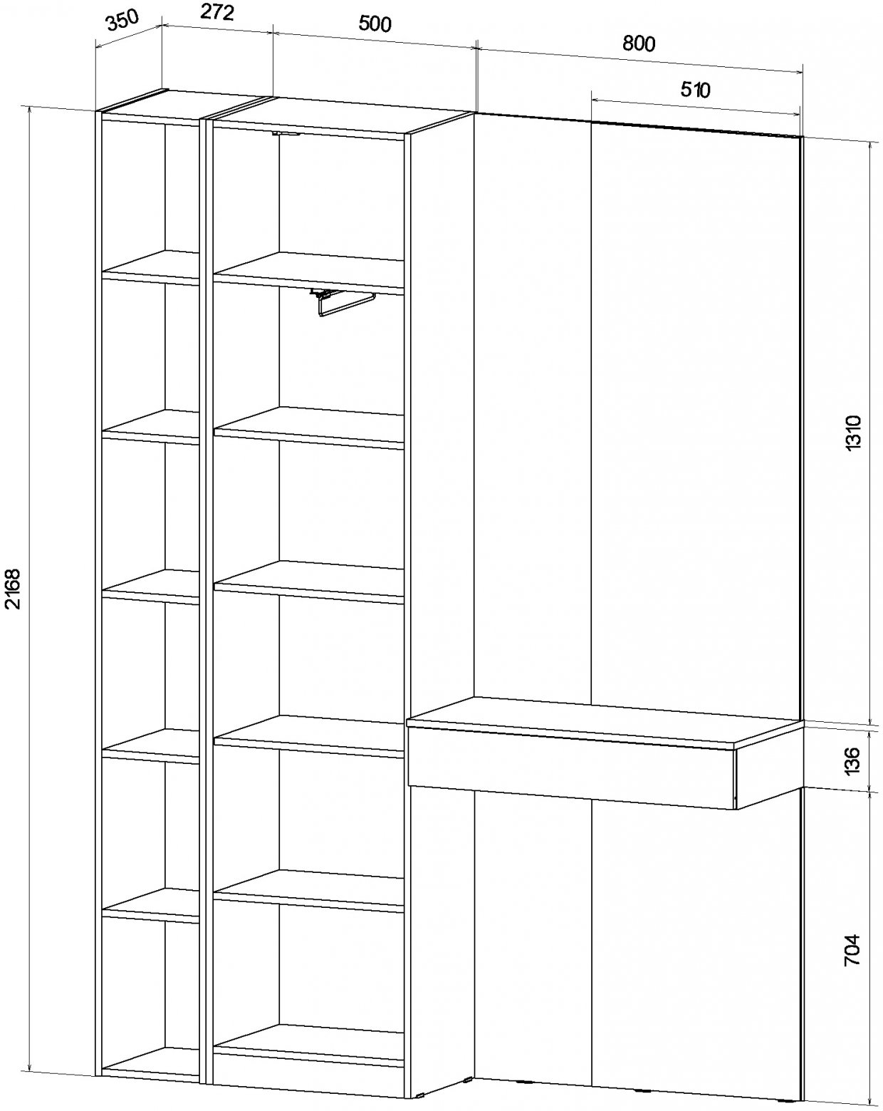 Габариты: 1572 (ширина) х 350 (глубина) х 2168 (высота) мм.