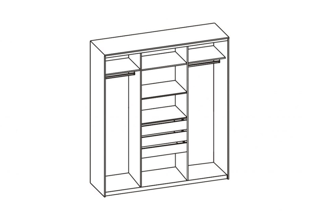 Слева и справа симметричные отделения с двумя полками, под ними металлическая штанга. В центре отделение с тремя полками и тремя выдвижными ящиками на роликовых направляющих.