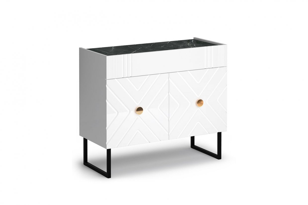 Корпуса изделий выполнены из ЛДСП 16 мм, фасады МДФ в пленке ПВХ глянец белый. Украшены дверки и ящики лаконичными ручками в цвете золото. Мебель оснащена надежной фурнитурой высокого качества: петли дверей имеют доводчик, а выдвижные ящики открываются при помощи направляющих скрытого типа.