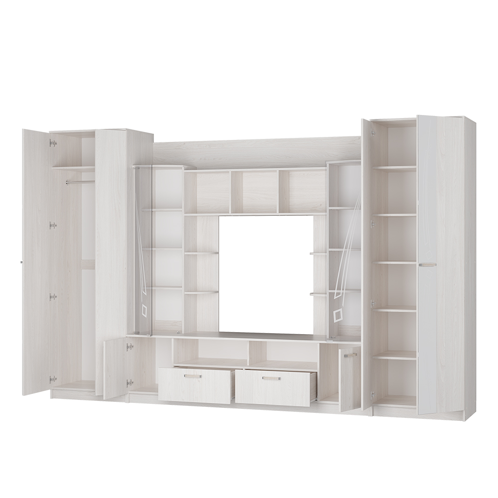 Гостиная «Венеция» – идеальный вариант для размещения большого количества вещей, включая одежду, ведь данная модель имеет зоны для ее хранения. Открытые полки вокруг ниши для телевизора позволят не только хранить предметы повседневного обихода, но и украсить интерьер. Стильные стеклостворки придают особую элегантность композиции изделия.